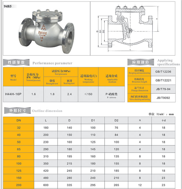 9485 H44H-16P不锈钢法兰止回阀